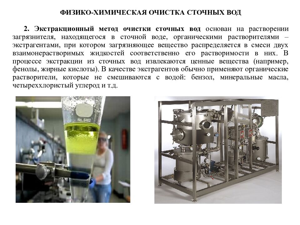 ФИЗИКО-ХИМИЧЕСКАЯ ОЧИСТКА СТОЧНЫХ ВОД 2. Экстракционный метод очистки сточных вод основан на растворении загрязнителя, находящегося в сточной воде, органическими растворителями – экстрагентами, при котором загрязняющее вещество распределяется в смеси двух взаимонерастворимых жидкостей соответственно его растворимости в них. В процессе экстракции из сточных вод извлекаются ценные вещества (например, фенолы, жирные кислоты). В качестве экстрагентов обычно применяют органические растворители, которые не смешиваются с водой: бензол, минеральные масла, четыреххлористый углерод и т.д.