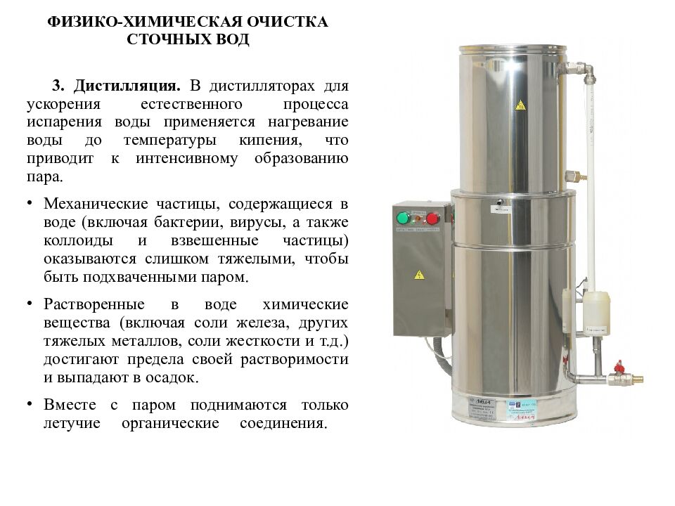 ФИЗИКО-ХИМИЧЕСКАЯ ОЧИСТКА СТОЧНЫХ ВОД 3. Дистилляция. В дистилляторах для ускорения естественного процесса испарения воды применяется нагревание воды до температуры кипения, что приводит к интенсивному образованию пара. Механические частицы, содержащиеся в воде (включая бактерии, вирусы, а также коллоиды и взвешенные частицы) оказываются слишком тяжелыми, чтобы быть подхваченными паром. Растворенные в воде химические вещества (включая соли железа, других тяжелых металлов, соли жесткости и т.д.) достигают предела своей растворимости и выпадают в осадок. Вместе с паром поднимаются только летучие органические соединения.