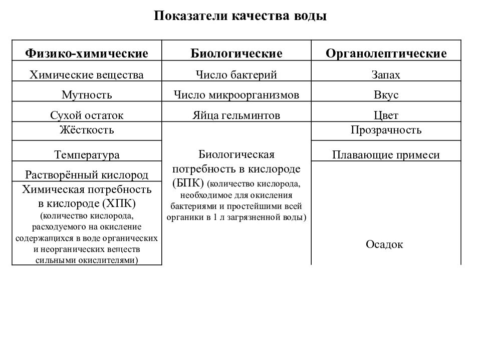 Физико-химические Биологические Органолептические Химические вещества Число бактерий Запах Мутность Число микроорганизмов Вкус Сухой остаток Яйца гельминтов Цвет Жёсткость Биологическая потребность в кислороде (БПК) ( количество кислорода, необходимое для окисления бактериями и простейшими всей органики в 1 л загрязненной воды ) Прозрачность Температура Плавающие примеси Растворённый кислород Осадок Химическая потребность в кислороде (ХПК) ( количество кислорода, расходуемого на окисление содержащихся в воде органических и неорганических веществ сильными окислителями ) Показатели качества воды