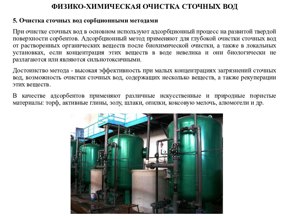 5. Очистка сточных вод сорбционными методами При очистке сточных вод в основном используют адсорбционный процесс на развитой твердой поверхности сорбентов. Адсорбционный метод применяют для глубокой очистки сточных вод от растворенных органических веществ после биохимической очистки, а также в локальных установках, если концентрация этих веществ в воде невелика и они биологически не разлагаются или являются сильнотоксичными. Достоинство метода - высокая эффективность при малых концентрациях загрязнений сточных вод, возможность очистки сточных вод, содержащих несколько веществ, а также рекуперации этих веществ. В качестве адсорбентов применяют различные искусственные и природные пористые материалы: торф, активные глины, золу, шлаки, опилки, коксовую мелочь, алюмогели и др. ФИЗИКО-ХИМИЧЕСКАЯ ОЧИСТКА СТОЧНЫХ ВОД