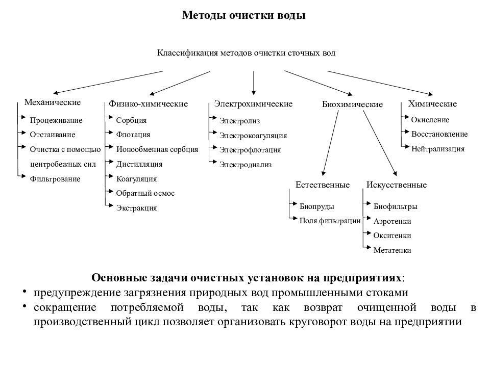 Классификация методов очистки сточных вод Механические Физико-химические Электрохимические Биохимические Химические Процеживание Отстаивание Очистка с помощью центробежных сил Фильтрование Сорбция Флотация Ионообменная сорбция Дистилляция Коагуляция Обратный осмос Экстракция Электролиз Электрокоагуляция Электрофлотация Электродиализ Окисление Восстановление Нейтрализация Естественные Искусственные Биофильтры Аэротенки Окситенки Метатенки Биопруды Поля фильтрации Основные задачи очистных установок на предприятиях : предупреждение загрязнения природных вод промышленными стоками сокращение потребляемой воды, так как возврат очищенной воды в производственный цикл позволяет организовать круговорот воды на предприятии Методы очистки воды
