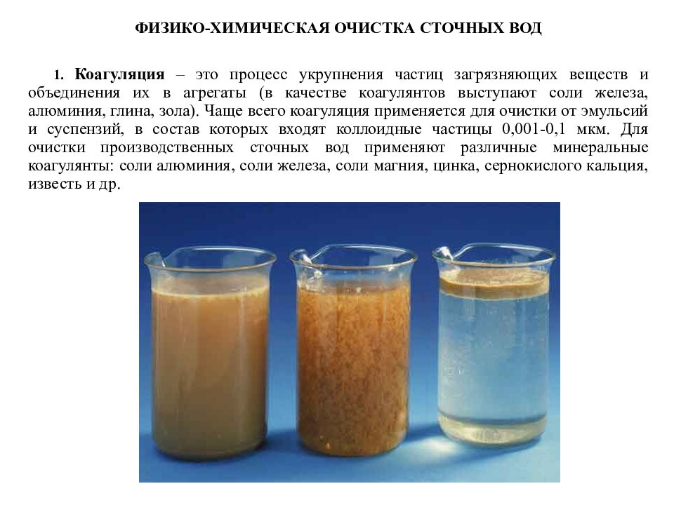 ФИЗИКО-ХИМИЧЕСКАЯ ОЧИСТКА СТОЧНЫХ ВОД 1. Коагуляция – это процесс укрупнения частиц загрязняющих веществ и объединения их в агрегаты (в качестве коагулянтов выступают соли железа, алюминия, глина, зола). Чаще всего коагуляция применяется для очистки от эмульсий и суспензий, в состав которых входят коллоидные частицы 0,001-0,1 мкм. Для очистки производственных сточных вод применяют различные минеральные коагулянты: соли алюминия, соли железа, соли магния, цинка, сернокислого кальция, известь и др.