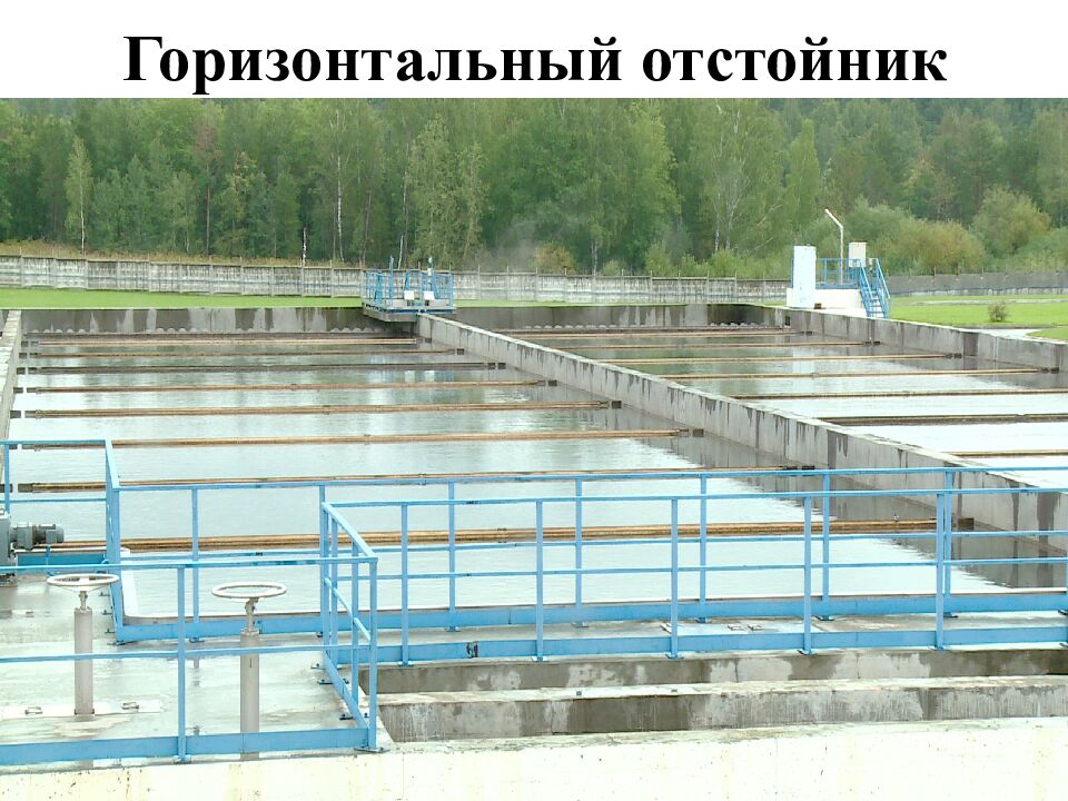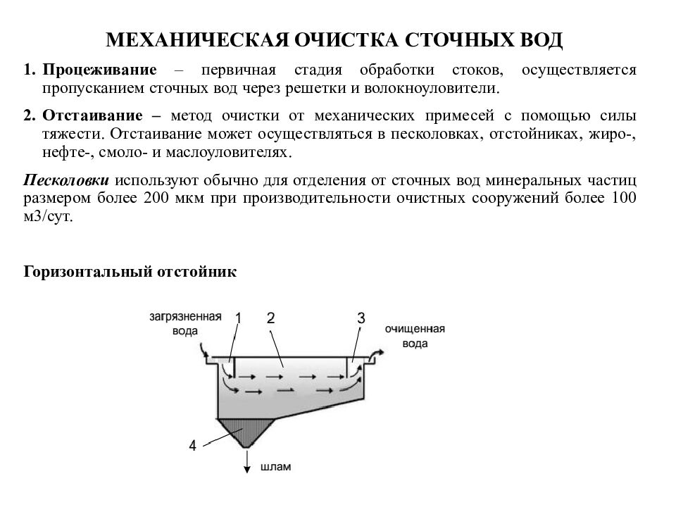 Процеживание – первичная стадия обработки стоков, осуществляется пропусканием сточных вод через решетки и волокноуловители. Отстаивание – метод очистки от механических примесей с помощью силы тяжести. Отстаивание может осуществляться в песколовках, отстойниках, жиро-, нефте -, смоло - и маслоуловителях. Песколовки используют обычно для отделения от сточных вод минеральных частиц размером более 200 мкм при производительности очистных сооружений более 100 м3/ сут. Горизонтальный отстойник Механическая очистка сточных вод
