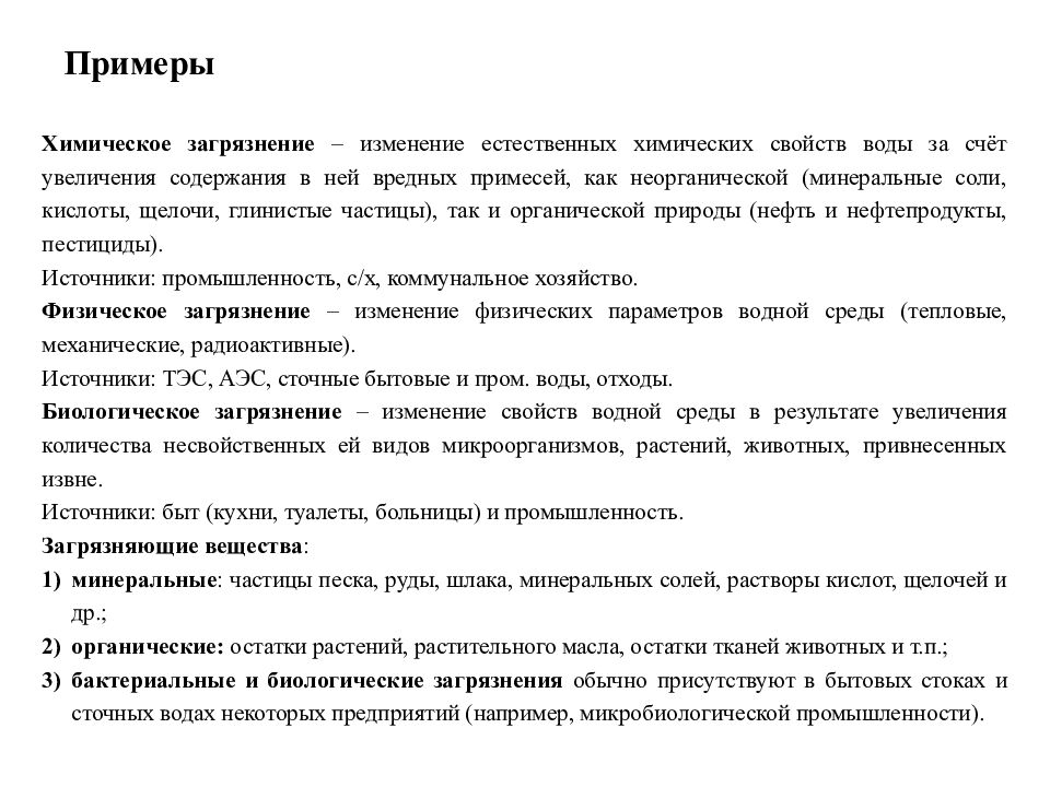 Химическое загрязнение – изменение естественных химических свойств воды за счёт увеличения содержания в ней вредных примесей, как неорганической (минеральные соли, кислоты, щелочи, глинистые частицы), так и органической природы (нефть и нефтепродукты, пестициды). Источники: промышленность, с/х, коммунальное хозяйство. Физическое загрязнение – изменение физических параметров водной среды (тепловые, механические, радиоактивные). Источники: ТЭС, АЭС, сточные бытовые и пром. воды, отходы. Биологическое загрязнение – изменение свойств водной среды в результате увеличения количества несвойственных ей видов микроорганизмов, растений, животных, привнесенных извне. Источники: быт (кухни, туалеты, больницы) и промышленность. Загрязняющие вещества : минеральные : частицы песка, руды, шлака, минеральных солей, растворы кислот, щелочей и др.; органические: остатки растений, растительного масла, остатки тканей животных и т.п.; бактериальные и биологические загрязнения обычно присутствуют в бытовых стоках и сточных водах некоторых предприятий (например, микробиологической промышленности). Примеры