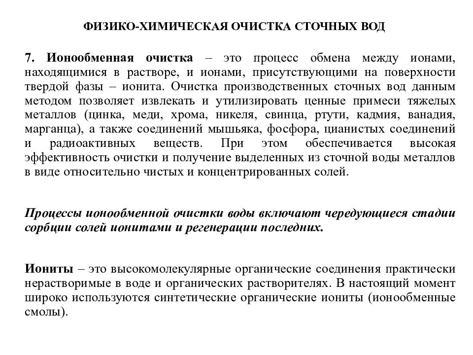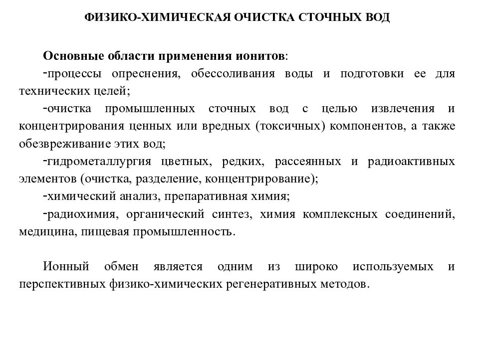 Основные области применения ионитов : процессы опреснения, обессоливания воды и подготовки ее для технических целей; очистка промышленных сточных вод с целью извлечения и концентрирования ценных или вредных (токсичных) компонентов, а также обезвреживание этих вод; гидрометаллургия цветных, редких, рассеянных и радиоактивных элементов (очистка, разделение, концентрирование); химический анализ, препаративная химия; радиохимия, органический синтез, химия комплексных соединений, медицина, пищевая промышленность. Ионный обмен является одним из широко используемых и перспективных физико-химических регенеративных методов. ФИЗИКО-ХИМИЧЕСКАЯ ОЧИСТКА СТОЧНЫХ ВОД