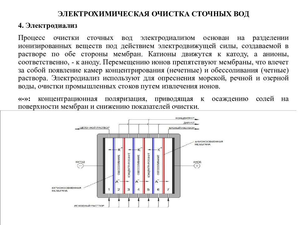 4. Электродиализ Процесс очистки сточных вод электродиализом основан на разделении ионизированных веществ под действием электродвижущей силы, создаваемой в растворе по обе стороны мембран. Катионы движутся к катоду, а анионы, соответственно, - к аноду. Перемещению ионов препятствуют мембраны, что влечет за собой появление камер концентрирования (нечетные) и обессоливания (четные) раствора. Электродиализ используют для опреснения морской, речной и озерной воды, очистки промышленных стоков путем извлечения ионов. «-»: концентрационная поляризация, приводящая к осаждению солей на поверхности мембран и снижению показателей очистки. ЭЛЕКТРОХИМИЧЕСКАЯ ОЧИСТКА СТОЧНЫХ ВОД