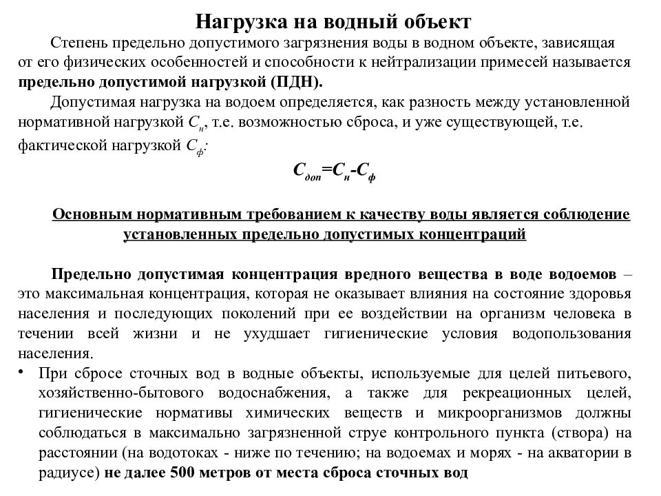 Степень предельно допустимого загрязнения воды в водном объекте, зависящая от его физических особенностей и способности к нейтрализации примесей называется предельно допустимой нагрузкой (ПДН). Допустимая нагрузка на водоем определяется, как разность между установленной нормативной нагрузкой С н, т.е. возможностью сброса, и уже существующей, т.е. фактической нагрузкой С ф : С доп = С н -С ф Основным нормативным требованием к качеству воды является соблюдение установленных предельно допустимых концентраций Предельно допустимая концентрация вредного вещества в воде водоемов – это максимальная концентрация, которая не оказывает влияния на состояние здоровья населения и последующих поколений при ее воздействии на организм человека в течении всей жизни и не ухудшает гигиенические условия водопользования населения. При сбросе сточных вод в водные объекты, используемые для целей питьевого, хозяйственно-бытового водоснабжения, а также для рекреационных целей, гигиенические нормативы химических веществ и микроорганизмов должны соблюдаться в максимально загрязненной струе контрольного пункта (створа) на расстоянии (на водотоках - ниже по течению; на водоемах и морях - на акватории в радиусе) не далее 500 метров от места сброса сточных вод Нагрузка на водный объект