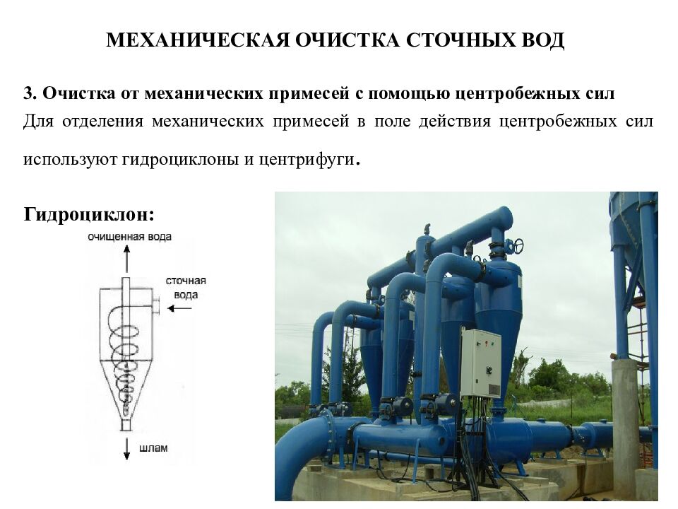 3. Очистка от механических примесей с помощью центробежных сил Для отделения механических примесей в поле действия центробежных сил используют гидроциклоны и центрифуги. Гидроциклон: Механическая очистка сточных вод