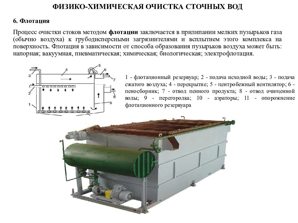 6. Флотация Процесс очистки стоков методом флотации заключается в прилипании мелких пузырьков газа (обычно воздуха) к грубодисперсными загрязнителями и всплытием этого комплекса на поверхность. Флотация в зависимости от способа образования пузырьков воздуха может быть: напорная; вакуумная, пневматическая; химическая; биологическая; электрофлотация. 1 - флотационный резервуар; 2 - подача исходной воды; 3 - подача сжатого воздуха; 4 - перекрытие; 5 - центробежный вентилятор; 6 - пеносборник ; 7 - отвод пенного продукта; 8 - отвод очищенной воды; 9 - перегородка; 10 - аэраторы; 11 - опорожнение флотационного резервуара ФИЗИКО-ХИМИЧЕСКАЯ ОЧИСТКА СТОЧНЫХ ВОД