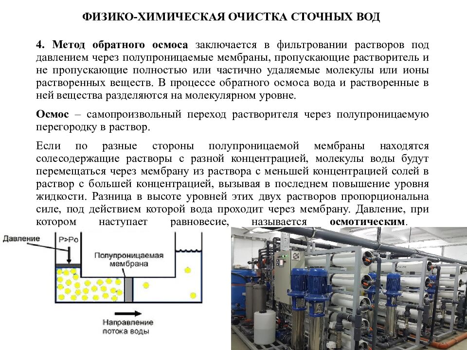 4. Метод обратного осмоса заключается в фильтровании растворов под давлением через полупроницаемые мембраны, пропускающие растворитель и не пропускающие полностью или частично удаляемые молекулы или ионы растворенных веществ. В процессе обратного осмоса вода и растворенные в ней вещества разделяются на молекулярном уровне. Осмос – самопроизвольный переход растворителя через полупроницаемую перегородку в раствор. Если по разные стороны полупроницаемой мембраны находятся солесодержащие растворы с разной концентрацией, молекулы воды будут перемещаться через мембрану из раствора с меньшей концентрацией солей в раствор с большей концентрацией, вызывая в последнем повышение уровня жидкости. Разница в высоте уровней этих двух растворов пропорциональна силе, под действием которой вода проходит через мембрану. Давление, при котором наступает равновесие, называется осмотическим. ФИЗИКО-ХИМИЧЕСКАЯ ОЧИСТКА СТОЧНЫХ ВОД