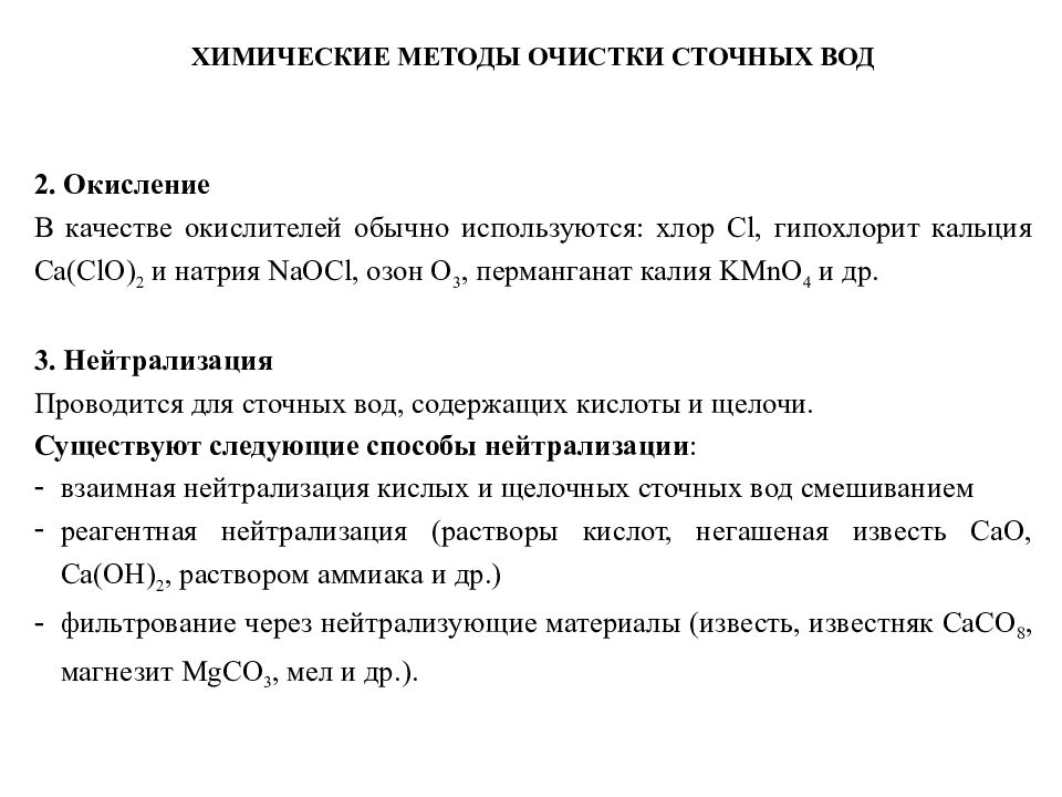 ХИМИЧЕСКИЕ МЕТОДЫ ОЧИСТКИ СТОЧНЫХ ВОД 2. Окисление В качестве окислителей обычно используются: хлор Cl, гипохлорит кальция Ca ( ClO ) 2 и натрия NaOCl, озон O 3, перманганат калия KМnO 4 и др. 3. Нейтрализация Проводится для сточных вод, содержащих кислоты и щелочи. Существуют следующие способы нейтрализации : взаимная нейтрализация кислых и щелочных сточных вод смешиванием реагентная нейтрализация (растворы кислот, негашеная известь CaO, Ca (OH) 2, раствором аммиака и др.) фильтрование через нейтрализующие материалы (известь, известняк CaCO 8, магнезит MgCO 3, мел и др.).