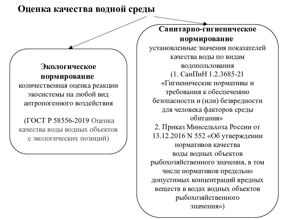 Экологическое нормирование количественная оценка реакции экосистемы на любой вид антропогенного воздействия (ГОСТ Р 58556-2019 Оценка качества воды водных объектов с экологических позиций) Санитарно-гигиеническое нормирование установленные значения показателей качества воды по видам водопользования (1. СанПиН 1.2.3685-21 «Гигиенические нормативы и требования к обеспечению безопасности и (или) безвредности для человека факторов среды обитания» 2. Приказ Минсельхоза России от 13.12.2016 N 552 «Об утверждении нормативов качества воды водных объектов рыбохозяйственного значения, в том числе нормативов предельно допустимых концентраций вредных веществ в водах водных объектов рыбохозяйственного значения»)