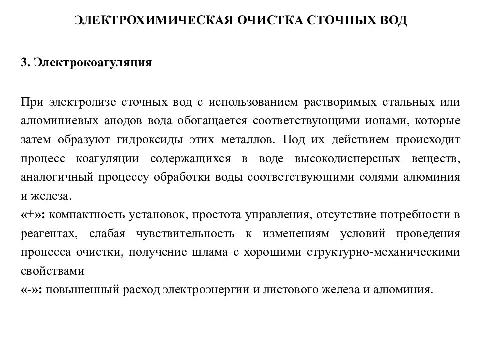 ЭЛЕКТРОХИМИЧЕСКАЯ ОЧИСТКА СТОЧНЫХ ВОД 3. Электрокоагуляция При электролизе сточных вод с использованием растворимых стальных или алюминиевых анодов вода обогащается соответствующими ионами, которые затем образуют гидроксиды этих металлов. Под их действием происходит процесс коагуляции содержащихся в воде высокодисперсных веществ, аналогичный процессу обработки воды соответствующими солями алюминия и железа. «+»: компактность установок, простота управления, отсутствие потребности в реагентах, слабая чувствительность к изменениям условий проведения процесса очистки, получение шлама с хорошими структурно-механическими свойствами «-»: повышенный расход электроэнергии и листового железа и алюминия.