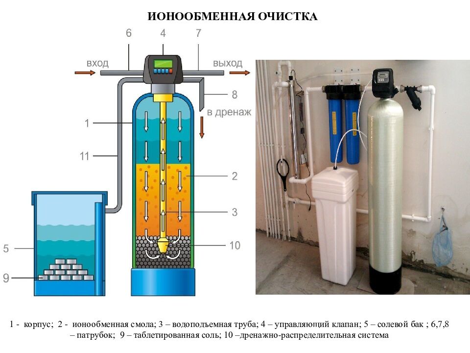 ИОНООБМЕННАЯ ОЧИСТКА 1 - корпус; 2 - ионообменная смола; 3 – водоподъемная труба; 4 – управляющий клапан; 5 – солевой бак ; 6,7,8 – патрубок; 9 – таблетированная соль; 10 –дренажно-распределительная система