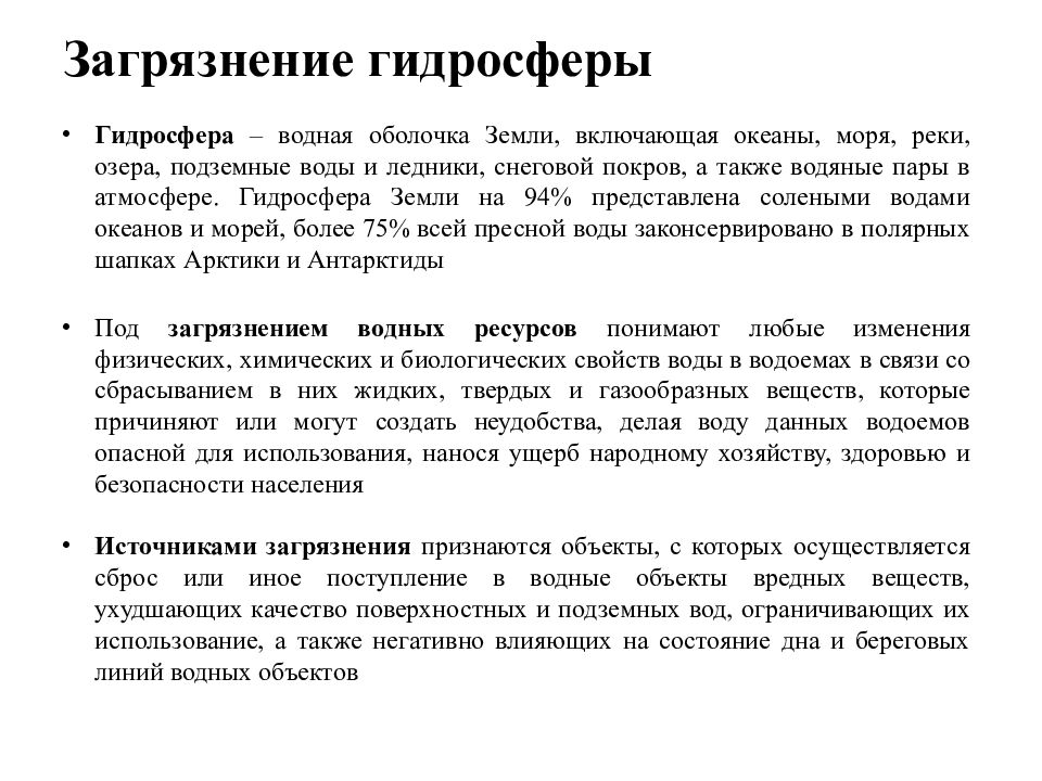 Гидросфера – водная оболочка Земли, включающая океаны, моря, реки, озера, подземные воды и ледники, снеговой покров, а также водяные пары в атмосфере. Гидросфера Земли на 94% представлена солеными водами океанов и морей, более 75% всей пресной воды законсервировано в полярных шапках Арктики и Антарктиды Под загрязнением водных ресурсов понимают любые изменения физических, химических и биологических свойств воды в водоемах в связи со сбрасыванием в них жидких, твердых и газообразных веществ, которые причиняют или могут создать неудобства, делая воду данных водоемов опасной для использования, нанося ущерб народному хозяйству, здоровью и безопасности населения Источниками загрязнения признаются объекты, с которых осуществляется сброс или иное поступление в водные объекты вредных веществ, ухудшающих качество поверхностных и подземных вод, ограничивающих их использование, а также негативно влияющих на состояние дна и береговых линий водных объектов