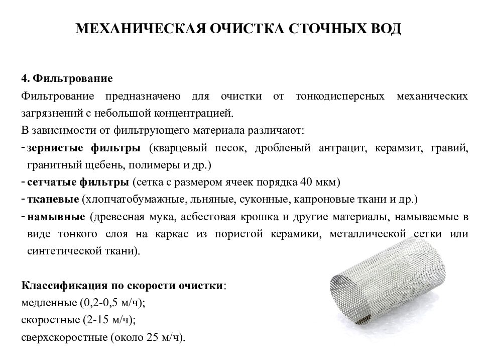 4. Фильтрование Фильтрование предназначено для очистки от тонкодисперсных механических загрязнений с небольшой концентрацией. В зависимости от фильтрующего материала различают: зернистые фильтры (кварцевый песок, дробленый антрацит, керамзит, гравий, гранитный щебень, полимеры и др.) сетчатые фильтры (сетка с размером ячеек порядка 40 мкм) тканевые (хлопчатобумажные, льняные, суконные, капроновые ткани и др.) намывные (древесная мука, асбестовая крошка и другие материалы, намываемые в виде тонкого слоя на каркас из пористой керамики, металлической сетки или синтетической ткани). Классификация по скорости очистки : медленные (0,2-0,5 м/ч); скоростные (2-15 м/ч); сверхскоростные (около 25 м/ч). Механическая очистка сточных вод