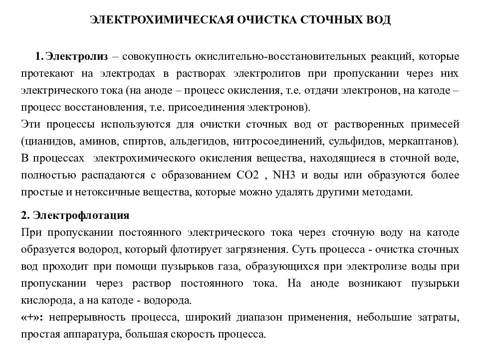 ЭЛЕКТРОХИМИЧЕСКАЯ ОЧИСТКА СТОЧНЫХ ВОД Электролиз – совокупность окислительно -восстановительных реакций, которые протекают на электродах в растворах электролитов при пропускании через них электрического тока (на аноде – процесс окисления, т.е. отдачи электронов, на катоде – процесс восстановления, т.е. присоединения электронов). Эти процессы используются для очистки сточных вод от растворенных примесей (цианидов, аминов, спиртов, альдегидов, нитросоединений, сульфидов, меркаптанов). В процессах электрохимического окисления вещества, находящиеся в сточной воде, полностью распадаются с образованием СО2, NH3 и воды или образуются более простые и нетоксичные вещества, которые можно удалять другими методами. 2. Электрофлотация При пропускании постоянного электрического тока через сточную воду на катоде образуется водород, который флотирует загрязнения. Суть процесса - очистка сточных вод проходит при помощи пузырьков газа, образующихся при электролизе воды при пропускании через раствор постоянного тока. На аноде возникают пузырьки кислорода, а на катоде - водорода. «+»: непрерывность процесса, широкий диапазон применения, небольшие затраты, простая аппаратура, большая скорость процесса.