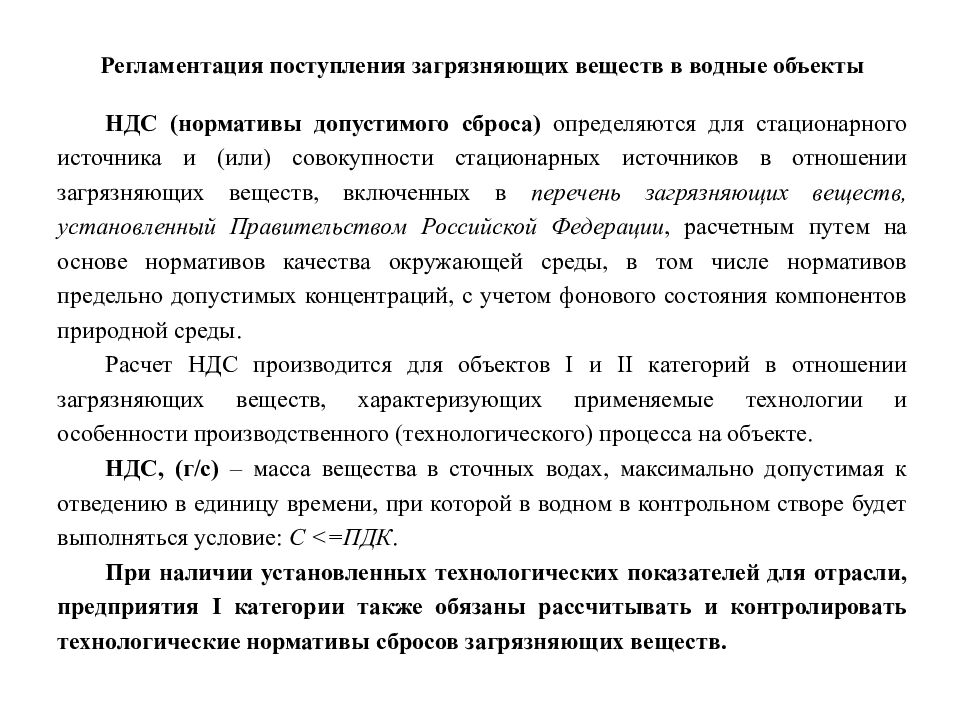НДС (нормативы допустимого сброса) определяются для стационарного источника и (или) совокупности стационарных источников в отношении загрязняющих веществ, включенных в перечень загрязняющих веществ, установленный Правительством Российской Федерации, расчетным путем на основе нормативов качества окружающей среды, в том числе нормативов предельно допустимых концентраций, с учетом фонового состояния компонентов природной среды. Расчет НДС производится для объектов I и II категорий в отношении загрязняющих веществ, характеризующих применяемые технологии и особенности производственного (технологического) процесса на объекте. НДС, (г/с) – масса вещества в сточных водах, максимально допустимая к отведению в единицу времени, при которой в водном в контрольном створе будет выполняться условие: С <= ПДК. При наличии установленных технологических показателей для отрасли, предприятия I категории также обязаны рассчитывать и контролировать технологические нормативы сбросов загрязняющих веществ.