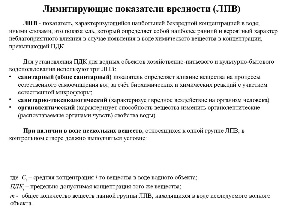 ЛПВ - показатель, характеризующийся наибольшей безвредной концентрацией в воде; иными словами, это показатель, который определяет собой наиболее ранний и вероятный характер неблагоприятного влияния в случае появления в воде химического вещества в концентрации, превышающей ПДК Для установления ПДК для водных объектов хозяйственно-питьевого и культурно-бытового водопользования используют три ЛПВ: санитарный (обще санитарный) показатель определяет влияние вещества на процессы естественного самоочищения вод за счёт биохимических и химических реакций с участием естественной микрофлоры; санитарно-токсикологический (характеризует вредное воздействие на организм человека) органолептический (характеризует способность вещества изменить органолептические (распознаваемые органами чувств) свойства воды) При наличии в воде нескольких веществ, относящихся к одной группе ЛПВ, в контрольном створе должно выполняться условие: где С i – средняя концентрация i - го вещества в воде водного объекта; ПДК i – предельно допустимая концентрация того же вещества; m - общее количество веществ данной группы ЛПВ, находящихся в воде исследуемого водного объекта. Лимитирующие показатели вредности (ЛПВ)