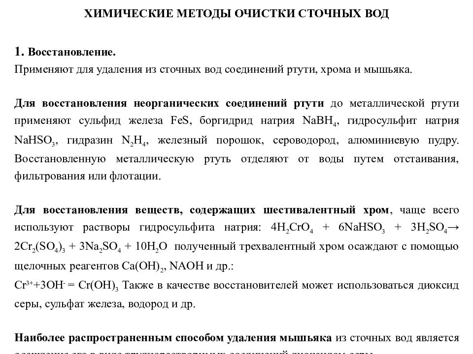 ХИМИЧЕСКИЕ МЕТОДЫ ОЧИСТКИ СТОЧНЫХ ВОД 1. Восстановление. Применяют для удаления из сточных вод соединений ртути, хрома и мышьяка. Для восстановления неорганических соединений ртути до металлической ртути применяют сульфид железа FeS, боргидрид натрия NaBH 4, гидросульфит натрия NaHSO 3, гидразин N 2 H 4, железный порошок, сероводород, алюминиевую пудру. Восстановленную металлическую ртуть отделяют от воды путем отстаивания, фильтрования или флотации. Для восстановления веществ, содержащих шестивалентный хром, чаще всего используют растворы гидросульфита натрия: 4H 2 CrO 4 + 6NaHSO 3 + 3H 2 SO 4 → 2Cr 2 (SO 4 ) 3 + 3Na 2 SO 4 + 10H 2 O полученный трехвалентный хром осаждают с помощью щелочных реагентов Ca (OH) 2, NAOH и др.: Cr 3+ +3OH - = Cr (OH) 3 Также в качестве восстановителей может использоваться диоксид серы, сульфат железа, водород и др. Наиболее распространенным способом удаления мышьяка из сточных вод является осаждение его в виде труднорастворимых соединений диоксидом серы.