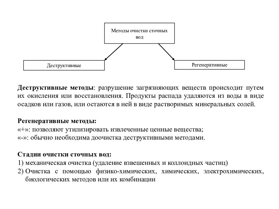 Методы очистки сточных вод Деструктивные Регенеративные Деструктивные методы : разрушение загрязняющих веществ происходит путем их окисления или восстановления. Продукты распада удаляются из воды в виде осадков или газов, или остаются в ней в виде растворимых минеральных солей. Регенеративные методы: «+»: позволяют утилизировать извлеченные ценные вещества; «-»: обычно необходима доочистка деструктивными методами. Стадии очистки сточных вод: механическая очистка (удаление взвешенных и коллоидных частиц) Очистка с помощью физико-химических, химических, электрохимических, биологических методов или их комбинации
