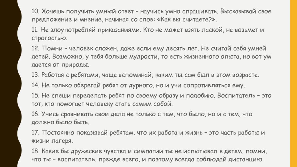 10. Хочешь получить умный ответ – научись умно спрашивать. Высказывай свое предложение и мнение, начиная со слов: «Как вы считаете?». 11. Не злоупотребляй приказаниями. Кто не может взять лаской, не возьмет и строгостью. 12. Помни – человек сложен, даже если ему десять лет. Не считай себя умней детей. Возможно, у тебя больше мудрости, то есть жизненного опыта, но вот ум дается от природы. 13. Работая с ребятами, чаще вспоминай, каким ты сам был в этом возрасте. 14. Не только оберегай ребят от дурного, но и учи сопротивляться ему. 15. Не спеши переделать ребят по своему образу и подобию. Воспитатель – это тот, кто помогает человеку стать самим собой. 16. Учись сравнивать свои дела не только с тем, что было, но и с тем, что должно было быть. 17. Постоянно показывай ребятам, что их работа и жизнь – это часть работы и жизни лагеря. 18. Какие бы дружеские чувства и симпатии ты не испытывал к детям, помни, что ты – воспитатель, прежде всего, и поэтому всегда соблюдай дистанцию.