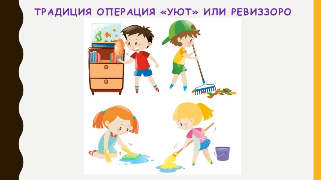 Постоянно заботится о чистоте и порядке в комнате, помещениях и на территории.