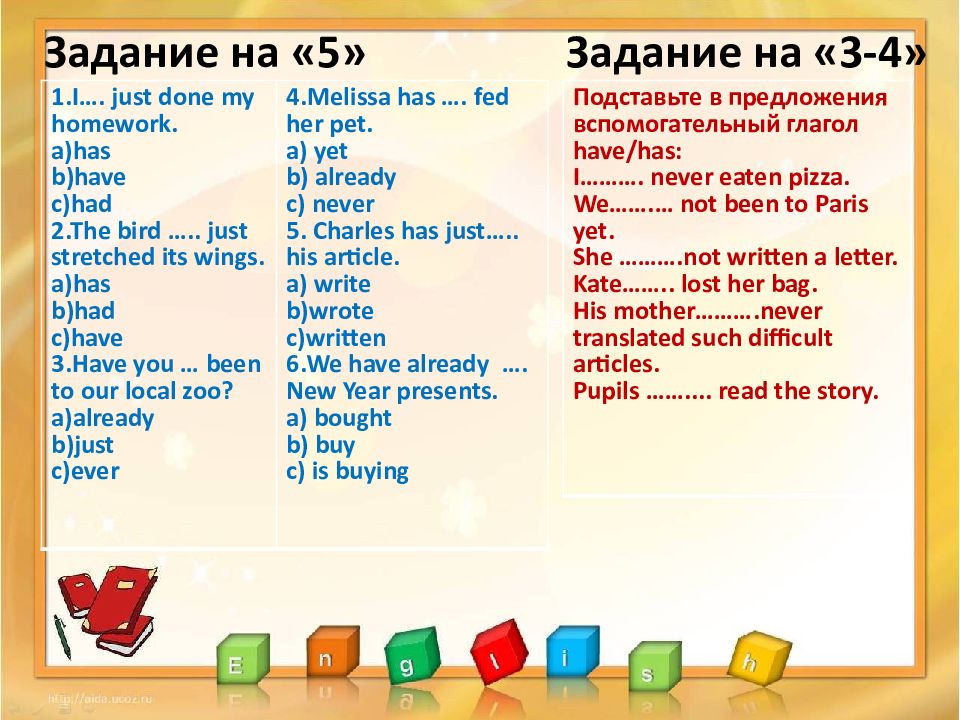 1.I…. just done my homework. a ) has b ) have c)had 2.The bird ….. just stretched its wings. a)has b)had c)have 3.Have you … been to our local zoo? a)already b)just c)ever 4.Melissa has …. fed her pet. a) yet b) already c) never 5. Charles has just….. his article. a) write b)wrote c)written 6.We have already …. New Year presents. a) bought b) buy c) is buying Подставьте в предложения вспомогательный глагол have / has : I………. never eaten pizza. We…….… not been to Paris yet. She ……….not written a letter. Kate…….. lost her bag. His mother……….never translated such difficult articles. Pupils …….... read the story.