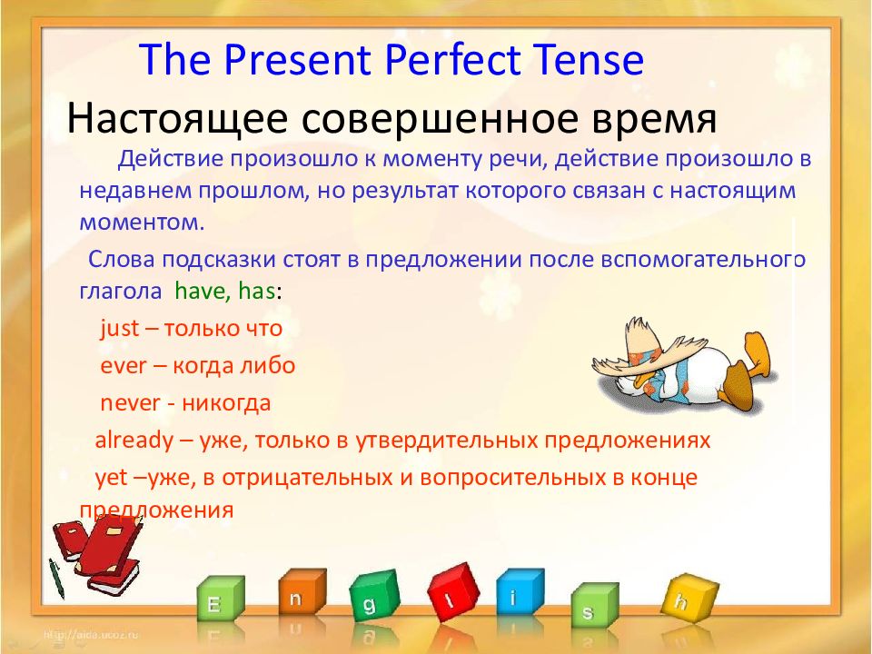 Действие произошло к моменту речи, действие произошло в недавнем прошлом, но результат которого связан с настоящим моментом. Слова подсказки стоят в предложении после вспомогательного глагола have, has : just – только что ever – когда либо never - никогда already – уже, только в утвердительных предложениях yet –уже, в отрицательных и вопросительных в конце предложения