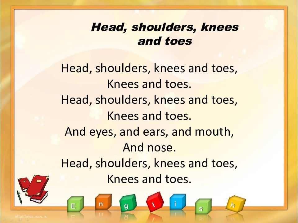 Слайд 6: Head, shoulders, knees and toes, Knees and toes. Head, shoulders, knees and toes, Knees and toes. And eyes, and ears, and mouth, And nose. Head, shoulders, knees and toes, Knees and toes