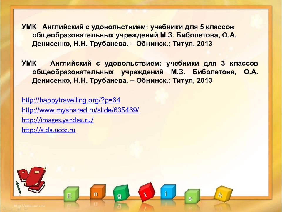 УМК Английский с удовольствием: учебники для 5 классов общеобразовательных учреждений М.З. Биболетова, О.А. Денисенко, Н.Н. Трубанева. – Обнинск.: Титул, 2013 УМК Английский с удовольствием: учебники для 3 классов общеобразовательных учреждений М.З. Биболетова, О.А. Денисенко, Н.Н. Трубанева. – Обнинск.: Титул, 2013 http://happytravelling.org/?p=64 http://www.myshared.ru/slide/635469/ http://images.yandex.ru/ http://aida.ucoz.ru