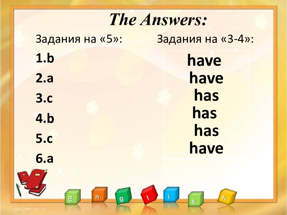 Задания на «5»: Задания на « 3-4 »: 1.b 2. a 3. c 4. b 5. c 6. a have have has has has have