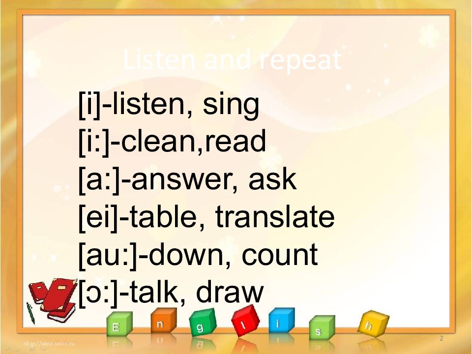 2 [ i ] - listen, sing [ i :] - clean, read [ а :] - answer, ask [ ei ] - table, translate [au:] - down, count [ɔ:] - talk, draw