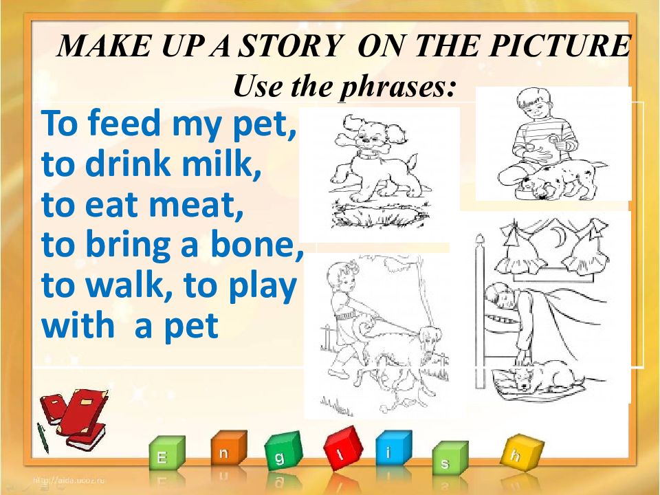 To feed my pet, to drink milk, to eat meat, to bring a bone, to walk, to play with a pet