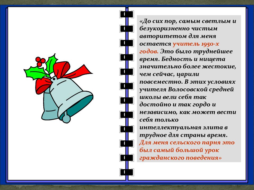 «До сих пор, самым светлым и безукоризненно чистым авторитетом для меня остается учитель 1950-х годов. Это было труднейшее время. Бедность и нищета значительно более жестокие, чем сейчас, царили повсеместно. В этих условиях учителя Волосовской средней школы вели себя так достойно и так гордо и независимо, как может вести себя только интеллектуальная элита в трудное для страны время. Для меня сельского парня это был самый большой урок гражданского поведения» Из выступления Прауста Р.Э.