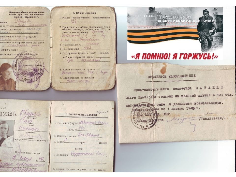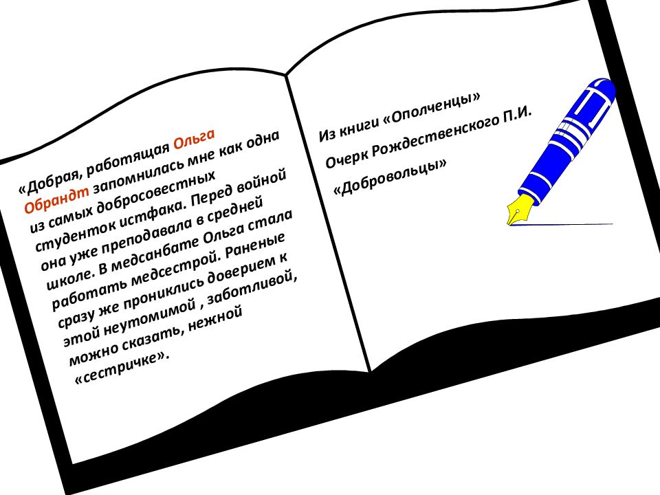 «Добрая, работящая Ольга Обрандт запомнилась мне как одна из самых добросовестных студенток истфака. Перед войной она уже преподавала в средней школе. В медсанбате Ольга стала работать медсестрой. Раненые сразу же прониклись доверием к этой неутомимой, заботливой, можно сказать, нежной «сестричке». Из книги «Ополченцы» Очерк Рождественского П.И. «Добровольцы»