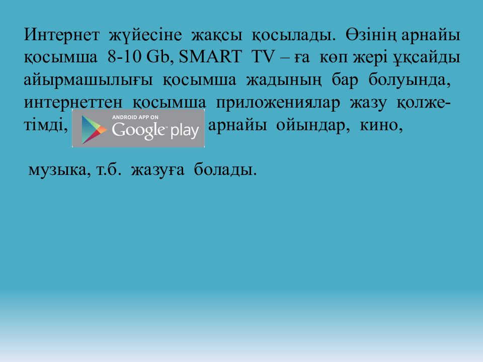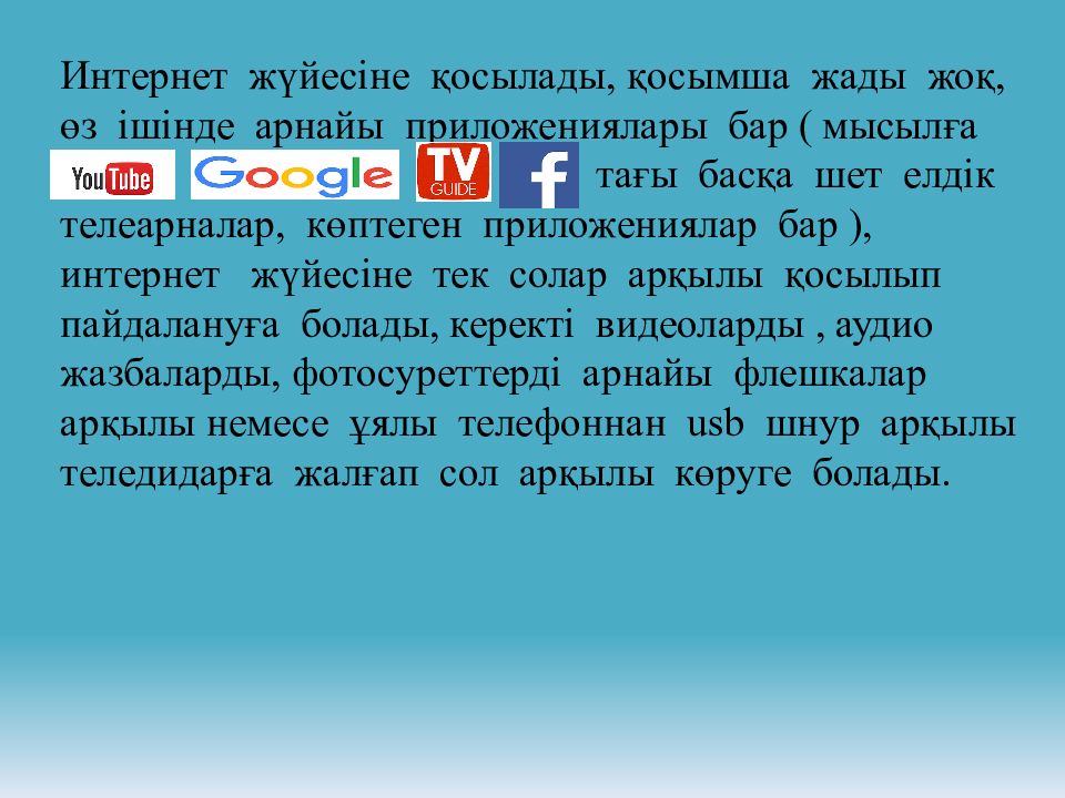 Интернет жүйесіне жақсы қосылады. Өзінің арнайы қосымша 8-10 Gb, SMART TV – ға көп жері ұқсайды айырмашылығы қосымша жадының бар болуында, интернеттен қосымша приложениялар жазу қолже-тімді, арнайы ойындар, кино, музыка, т.б. жазуға болады.