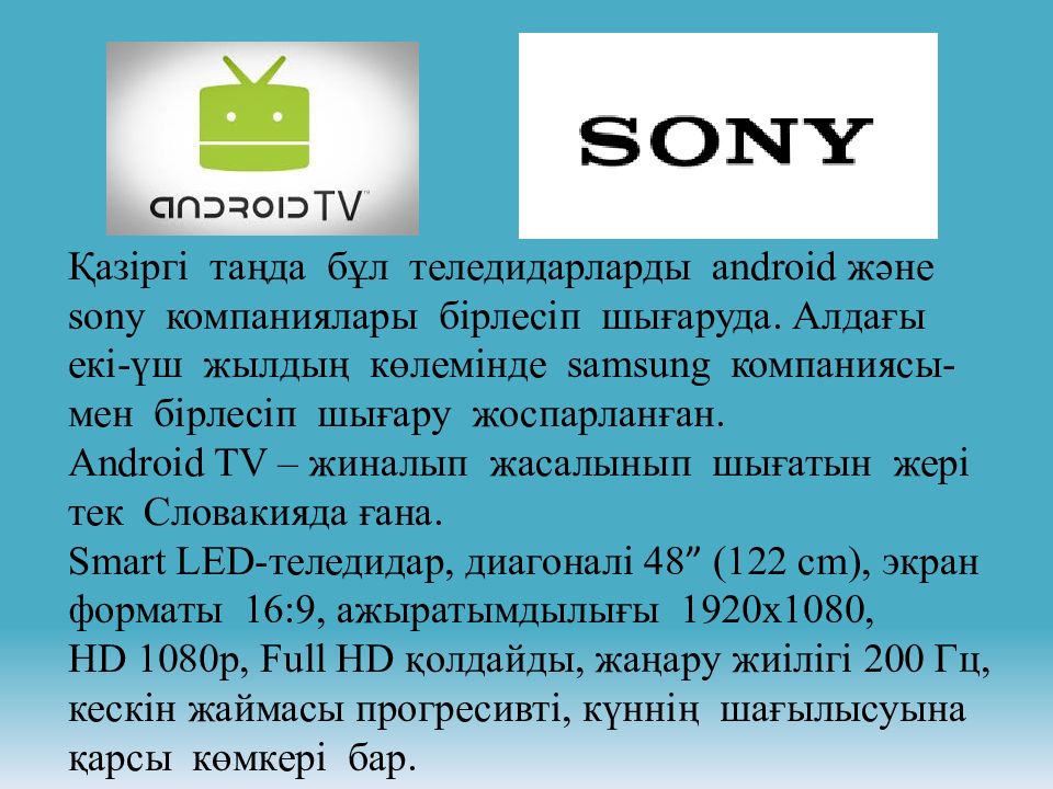 Қазіргі таңда бұл теледидарларды android және sony компаниялары бірлесіп шығаруда. Алдағы екі-үш жылдың көлемінде samsung компаниясы-мен бірлесіп шығару жоспарланған. Android TV – жиналып жасалынып шығатын жері тек Словакияда ғана. Smart LED- теледидар, диагоналі 48 ” (1 22 cm), экран форматы 16 :9, ажыратымдылығы 1920х1080, HD 1080p, Full HD қолдайды, жаңару жиілігі 200 Гц, кескін жаймасы прогресивті, күннің шағылысуына қарсы көмкері бар.