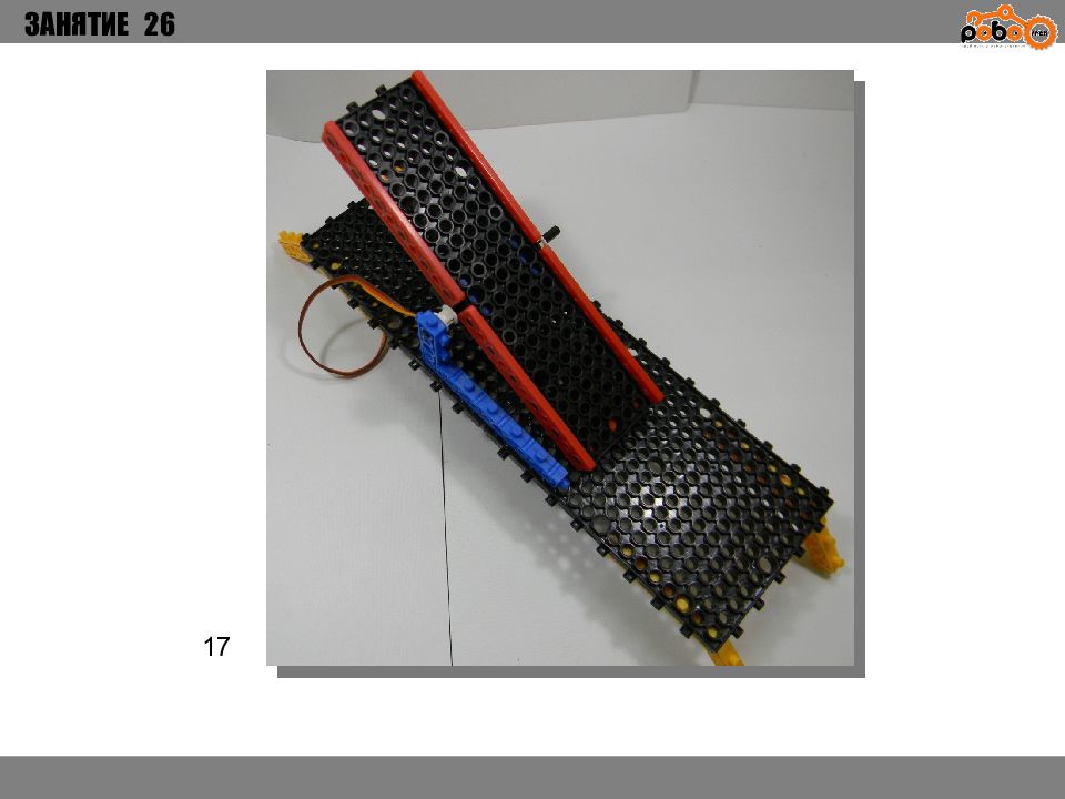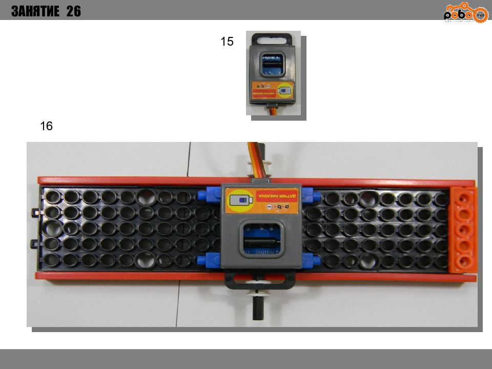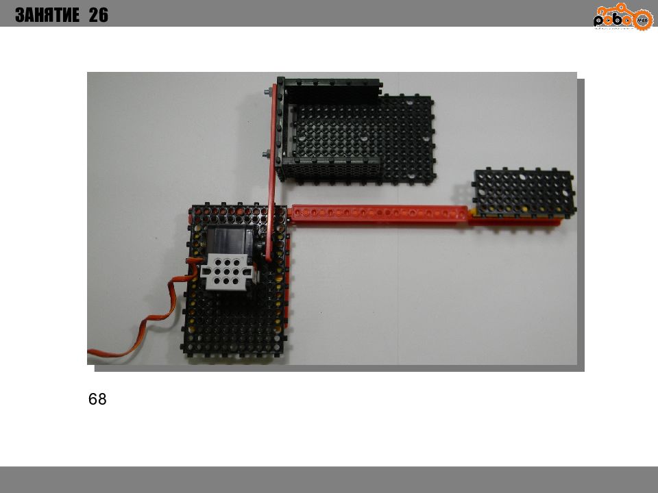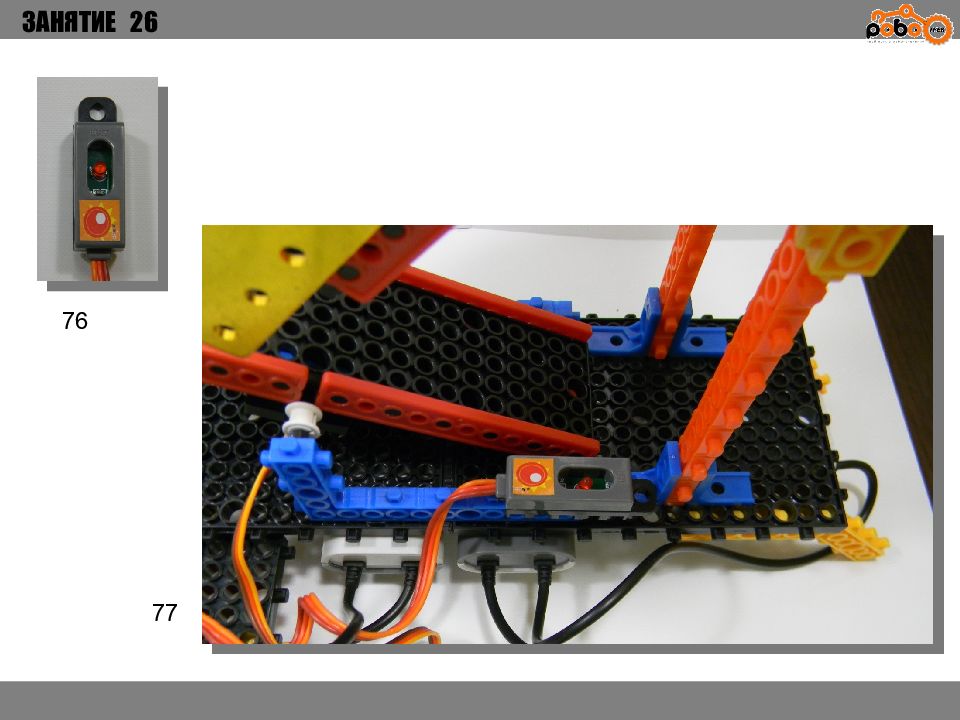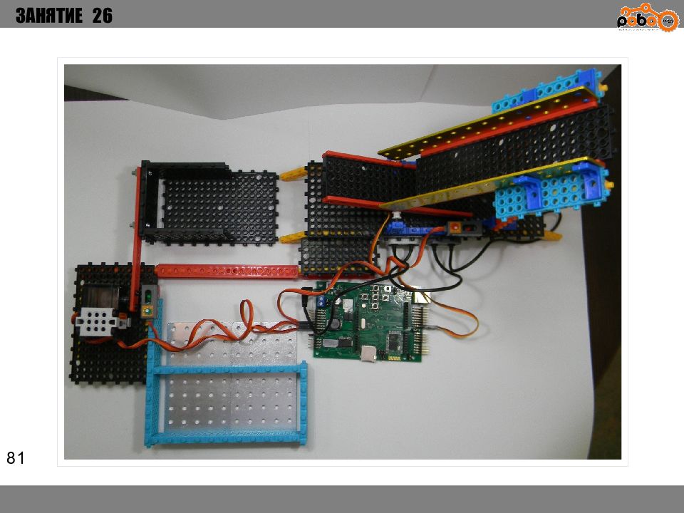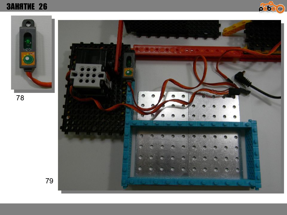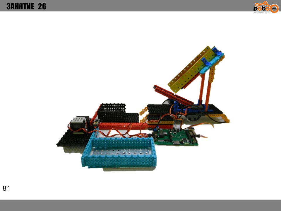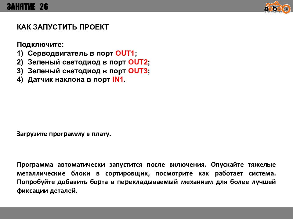 ЗАНЯТИЕ 26 КАК ЗАПУСТИТЬ ПРОЕКТ Подключите: Серводвигатель в порт OUT1 ; Зеленый светодиод в порт OUT 2 ; Зеленый светодиод в порт OUT 3 ; Датчик наклона в порт IN1. Загрузите программу в плату. Программа автоматически запустится после включения. Опускайте тяжелые металлические блоки в сортировщик, посмотрите как работает система. Попробуйте добавить борта в перекладываемый механизм для более лучшей фиксации деталей.