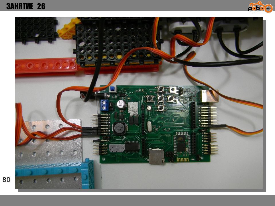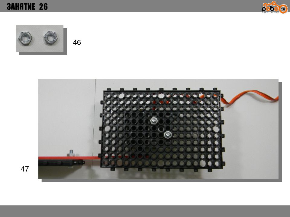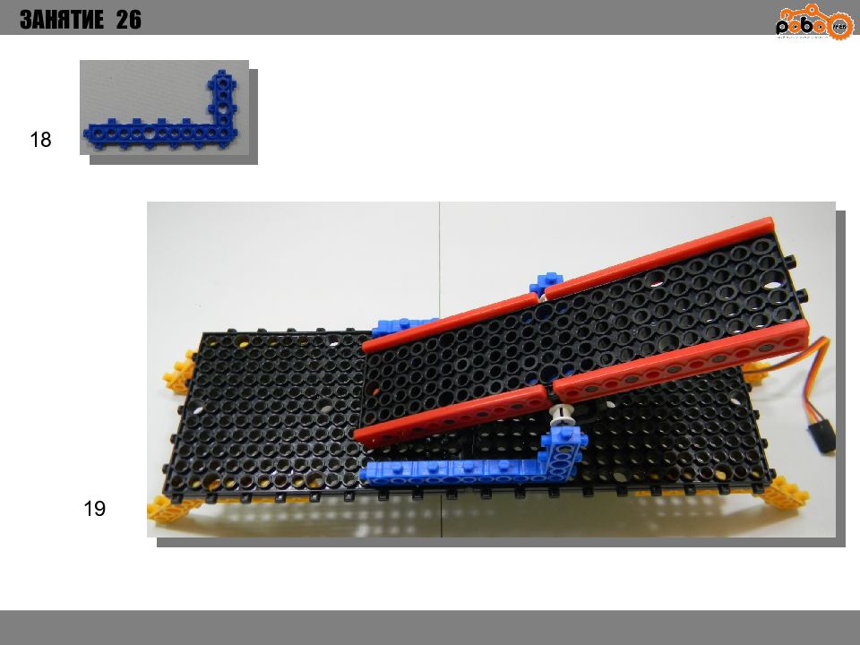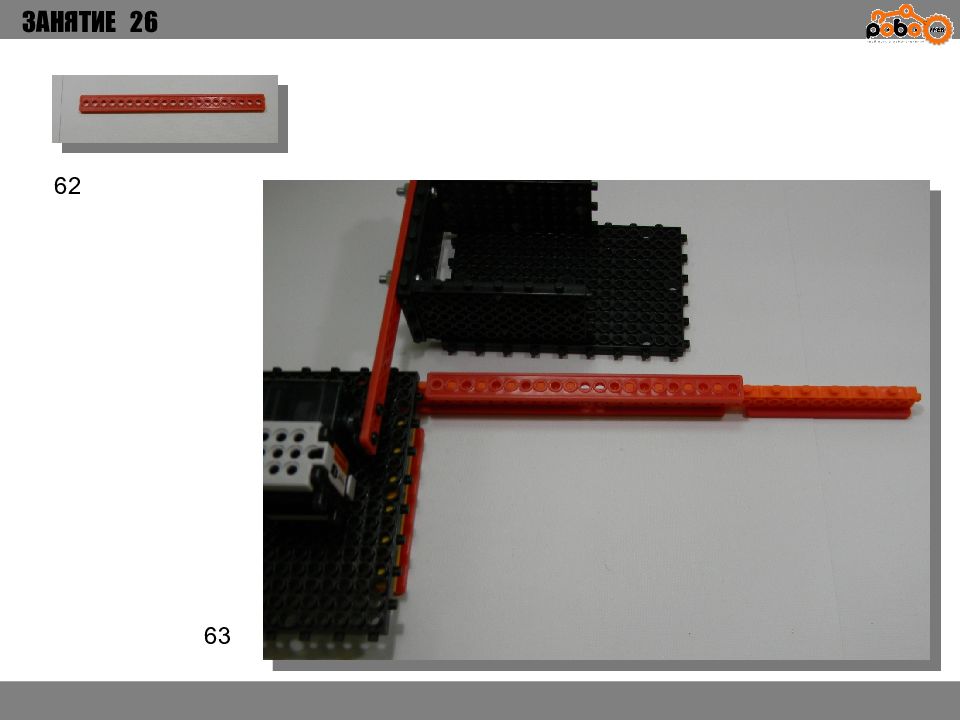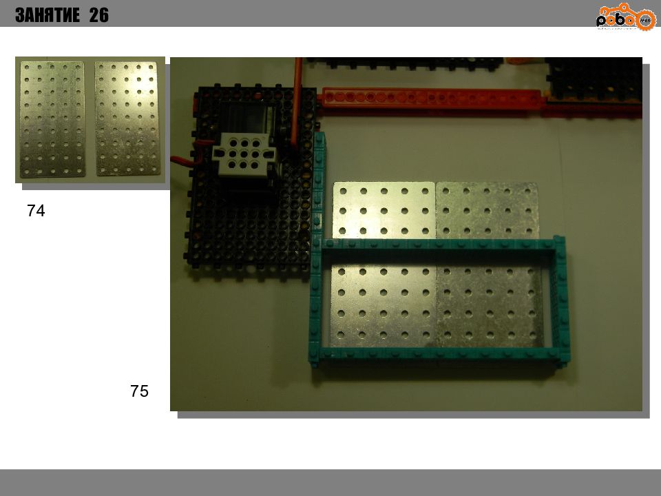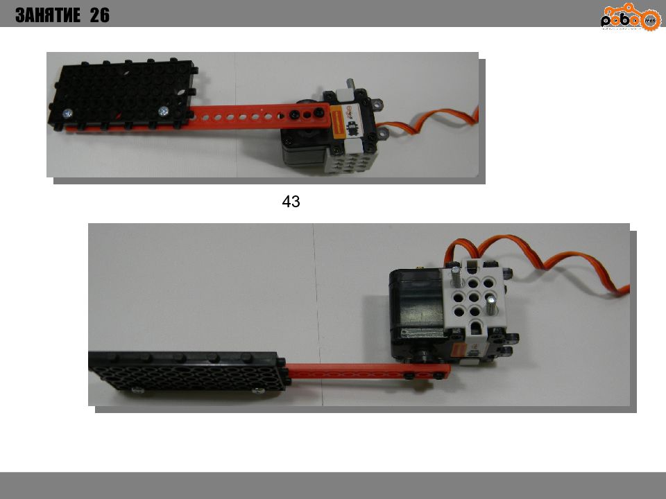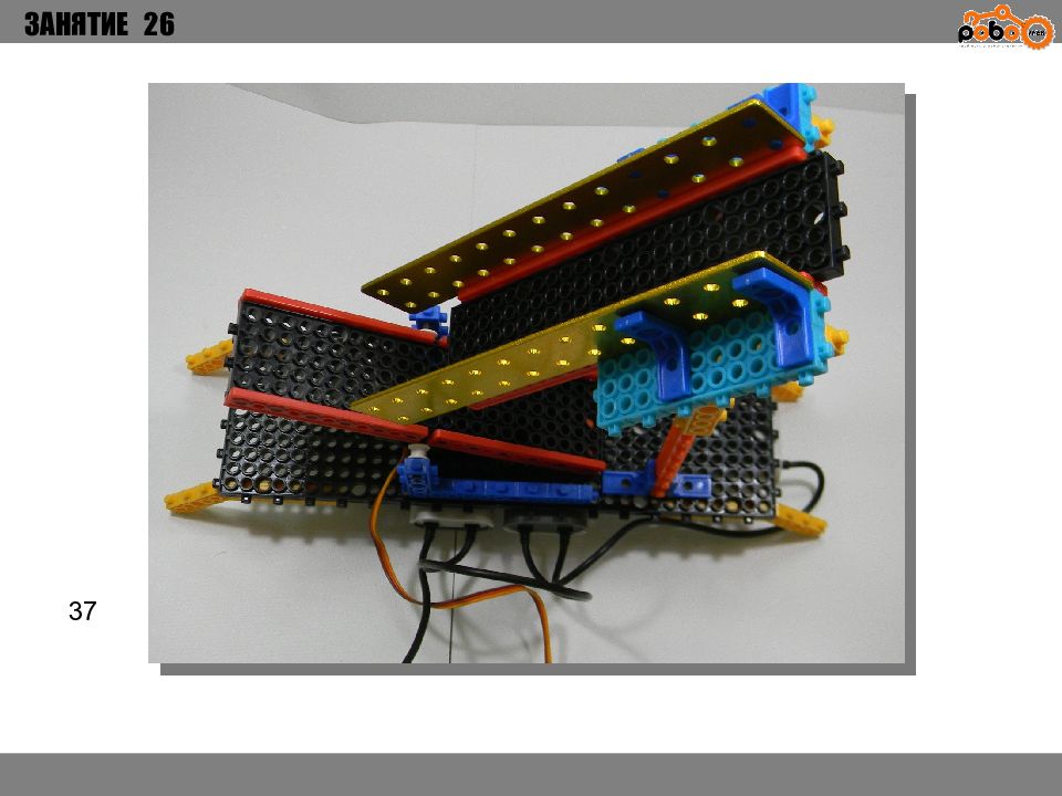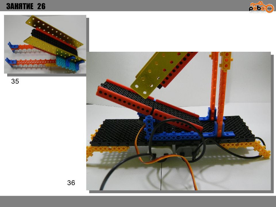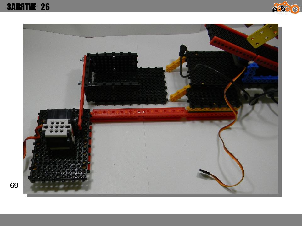 ЗАНЯТИЕ 26 КАК ЗАПУСТИТЬ ПРОЕКТ Подключите: Серводвигатель в порт OUT1 ; Зеленый светодиод в порт OUT 2 ; Зеленый светодиод в порт OUT 3 ; Датчик наклона в порт IN1. Загрузите программу в плату. Программа автоматически запустится после включения. Опускайте тяжелые металлические блоки в сортировщик, посмотрите как работает система. Попробуйте добавить борта в перекладываемый механизм для более лучшей фиксации деталей.