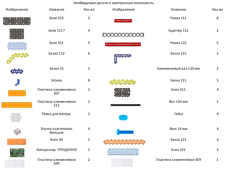 Необходимые детали и электронные компоненты Изображение Название Кол-во Изображение Название Кол-во Блок 523 2 Рамка 111 8 Блок 1117 4 Адаптер 111 2 Блок 311 3 Рамка 121 5 Балка 112 6 Балка 115 2 Балка 15 2 Алюминиевый вал 120 мм 2 Уголок 8 Балка 111 3 Пластина алюминиевая 207 1 Блок 511 4 Пластина алюминиевая 213 2 Вал 110 мм 1 Рамка для мотора 2 Гайка 4 Втулка пластиковая большая 4 Болт 16 мм 4 Блок A3 1 Балка 121 4 Контроллер ТРЕКДУИНО 1 Блок 321 3 Пластина алюминиевая 509 2 Пластина алюминиевая 309 1