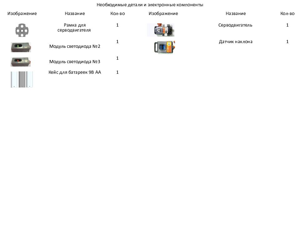 Необходимые детали и электронные компоненты Изображение Название Кол-во Изображение Название Кол-во Рамка для серводвигателя 1 Серводвигатель 1 Модуль светодиода №2 1 Датчик наклона 1 Модуль светодиода №3 1 Кейс для батареек 9В AA 1