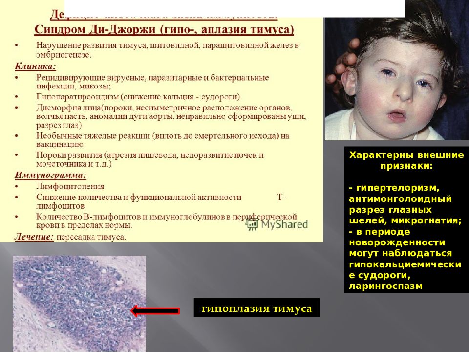 гипоплазия тимуса Характерны внешние признаки: - гипертелоризм, антимонголоидный разрез глазных шелей, микрогнатия ; - в периоде новорожденности могут наблюдаться гнпокальциемические судороги, ларингоспазм ; Х арактерны внешние признаки: - гипертелоризм, антимонголоидный разрез глазных шелей, микрогнатия ; - в периоде новорожденности могут наблюдаться гипокальциемические судороги, ларингоспазм