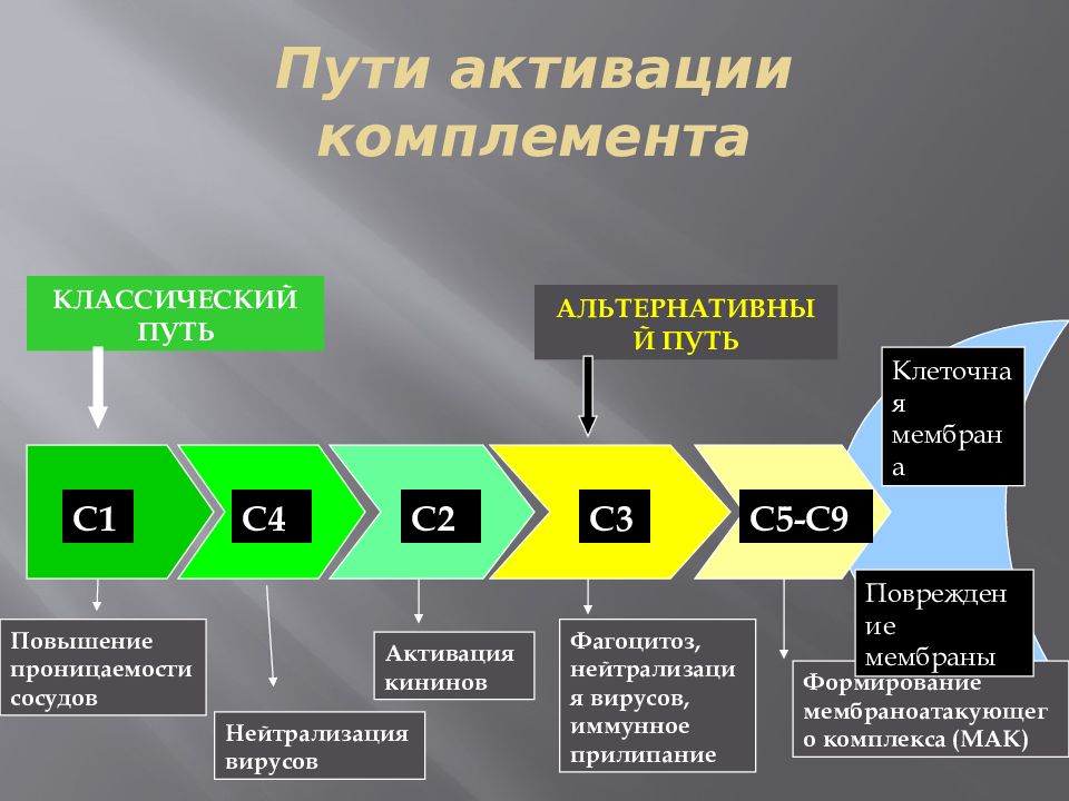 КЛАССИЧЕСКИЙ ПУТЬ АЛЬТЕРНАТИВНЫЙ ПУТЬ С1 С2 С4 С3 С5-С9 Повышение проницаемости сосудов Нейтрализация вирусов Активация кининов Фагоцитоз, нейтрализация вирусов, иммунное прилипание Формирование мембраноатакующего комплекса (МАК) Клеточная мембрана Повреждение мембраны