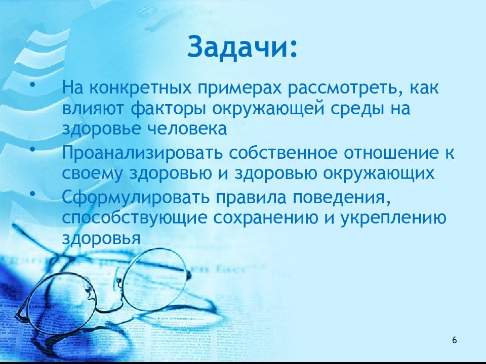 На конкретных примерах рассмотреть, как влияют факторы окружающей среды на здоровье человека Проанализировать собственное отношение к своему здоровью и здоровью окружающих Сформулировать правила поведения, способствующие сохранению и укреплению здоровья 6