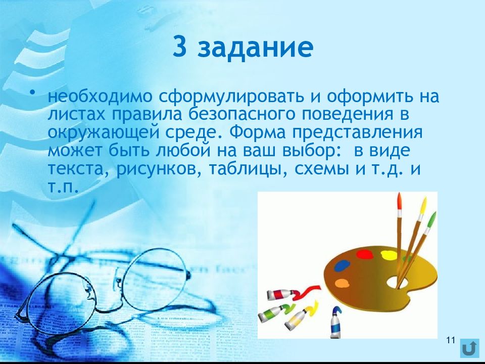 необходимо сформулировать и оформить на листах правила безопасного поведения в окружающей среде. Форма представления может быть любой на ваш выбор: в виде текста, рисунков, таблицы, схемы и т.д. и т.п. 11