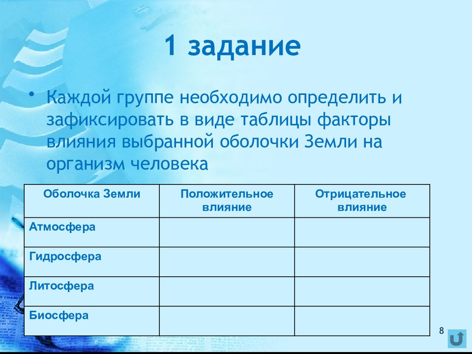 Каждой группе необходимо определить и зафиксировать в виде таблицы факторы влияния выбранной оболочки Земли на организм человека Оболочка Земли Положительное влияние Отрицательное влияние Атмосфера Гидросфера Литосфера Биосфера 8