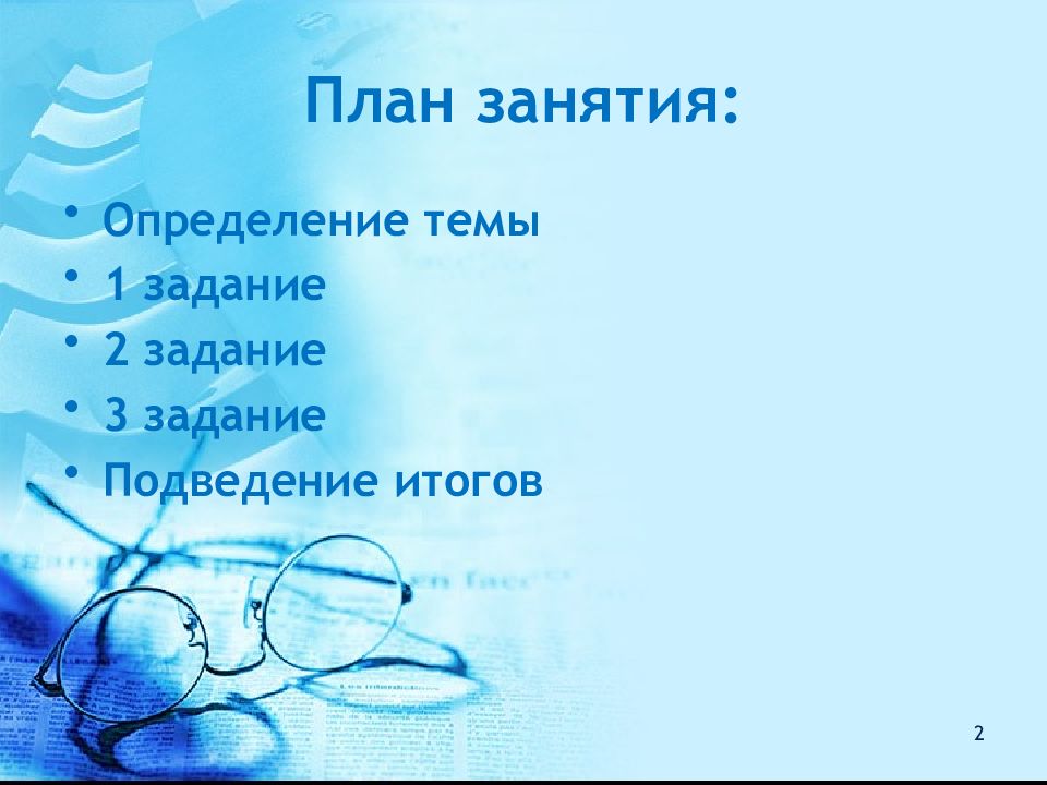 Определение темы 1 задание 2 задание 3 задание Подведение итогов 2