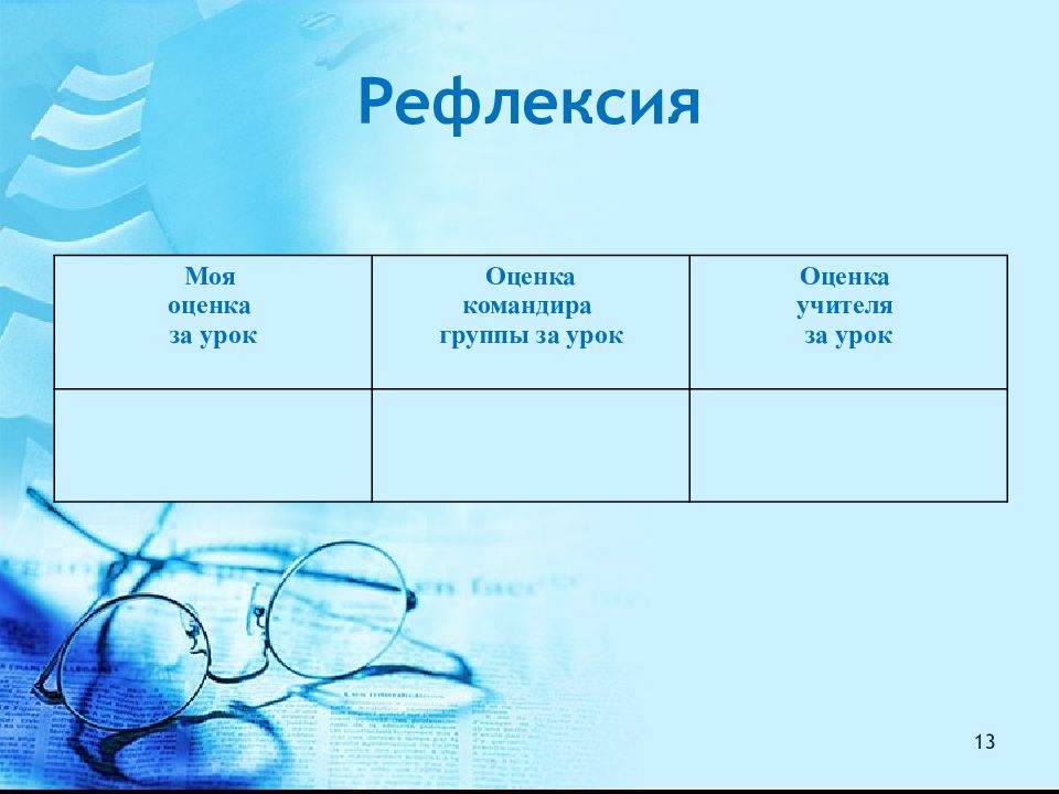 Моя оценка за урок Оценка командира группы за урок Оценка учителя за урок 13