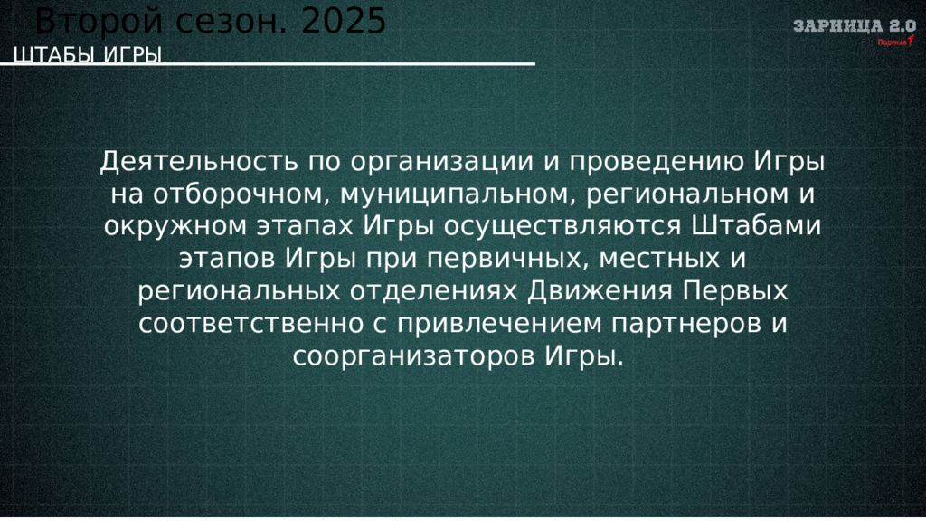 Второй сезон. 2025 ШТАБЫ ИГРЫ Деятельность по организации и проведению Игры на отборочном, муниципальном, региональном и окружном этапах Игры осуществляются Штабами этапов Игры при первичных, местных и региональных отделениях Движения Первых соответственно с привлечением партнеров и соорганизаторов Игры.